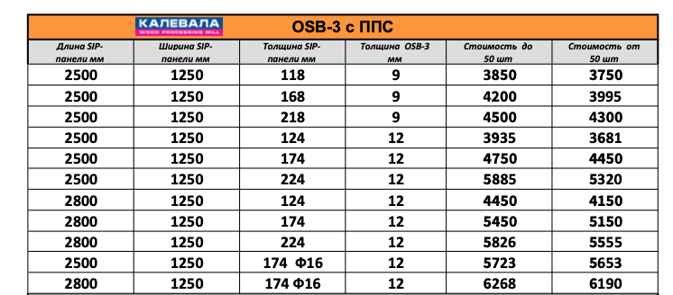Прайс-лист на панели СИП OSB-3 «Kalevala»/«Taleon»
